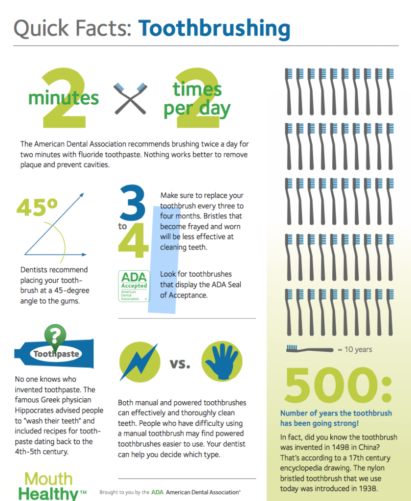 This infographic from the American Dental Association gives additional information on brushing your teeth. Aim to brush your teeth for two minutes per day, twice daily. Replace your toothbrush every three to four months.